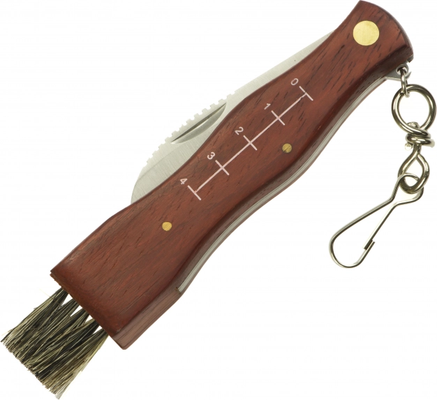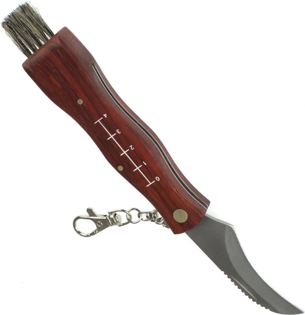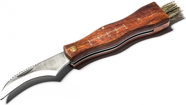 Acest cuțit universal pentru cules ciuperci combină o lamă curbată ascuțită pentru tăieri precise cu o pensulă fină pentru îndepărtarea impurităților. Mânerul din lemn se așază perfect în mână, iar rigla integrată pe o parte ajută la estimarea rapidă a dimensiunii prăzii.