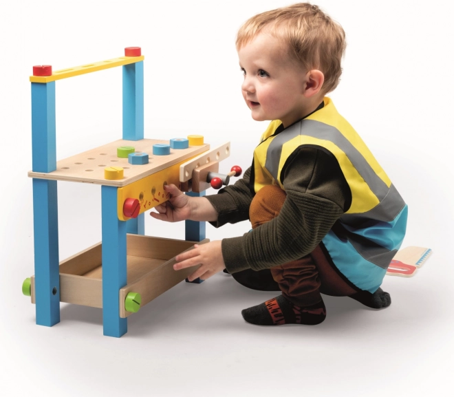 Setul include unelte din lemn și plastic – fierăstrău, șurubelniță, cheie reglabilă, ciocan, ochelari de protecție și legitimație. Copiii pot imita munca constructorilor și își pot dezvolta motricitatea fină.
