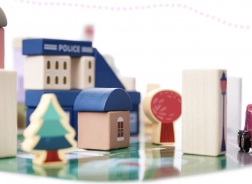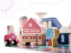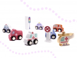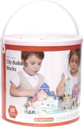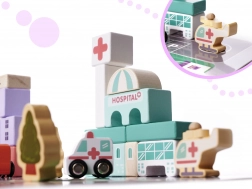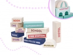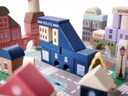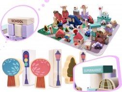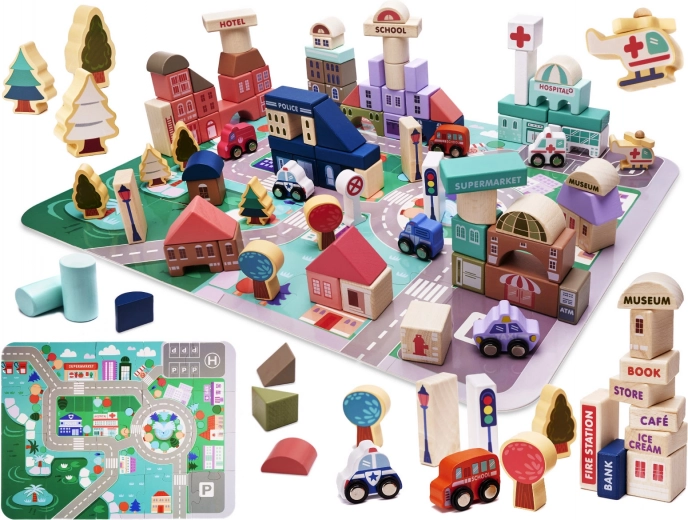 Blocurile de lemn bogat colorate reprezintă diverse clădiri și vehicule, oferind copiilor posibilitatea de a-și dezvolta imaginația și motricitatea fină.