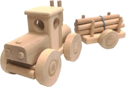 Datorită marginilor rotunjite și lustruirii atente, jucăria este plăcută la atingere și sigură pentru copiii de la 3 ani. Roțile rotative și cuplarea funcțională a remorcii susțin dezvoltarea motricității fine, imaginația și jocurile de rol cu fermieri și utilaje forestiere.