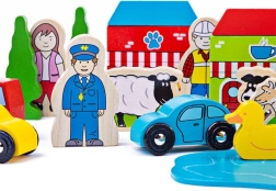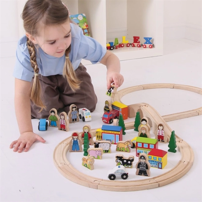 Acest set bogat aduce în orice cale ferată pentru copii un orășel animat și mediul rural. Include figurine precum polițist și pompier, vehicule utile, inclusiv autoturism și autospecială de pompieri, clădiri, copaci și animale domestice – toate în execuție rezistentă din lemn, cu culori plăcute. Copiii își pot crea propriile povești, pot opri trenurile, dirija traficul sau îngriji ferma.