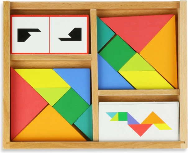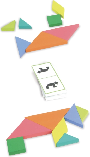 În set găsiți două seturi complete de tangrame pentru un duel față în față, peste 100 de cartonașe cu provocări și reguli clare. Piesele din lemn sunt plăcute la atingere, rezistente și ideale pentru joacă repetată acasă sau la școală.