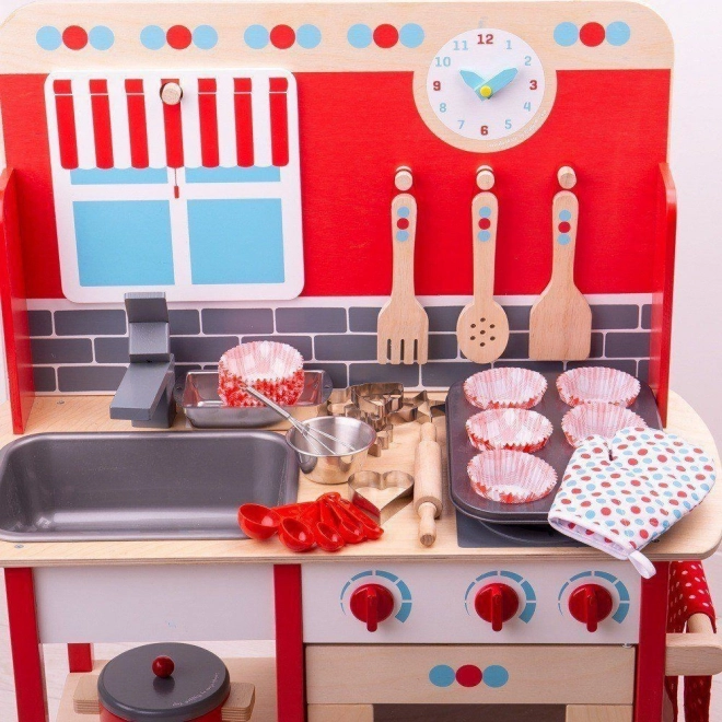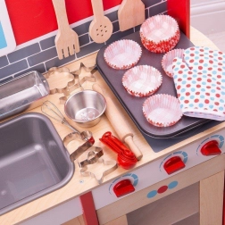 Acest set complex pentru copt conține tot echipamentul de care are nevoie orice mic bucătar pentru primele sale activități de cofetărie. Include tavă de copt, mănușă de protecție, formă de pâine, tel, sucitor din lemn, bol, set de linguri de măsurat și șase forme pentru aluat.