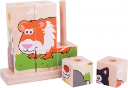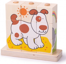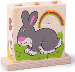 Cele nouă cuburi formează patru motive diferite cu animăluțe, care invită la asamblare repetată și susțin gândirea logică și percepția vizuală.