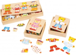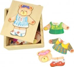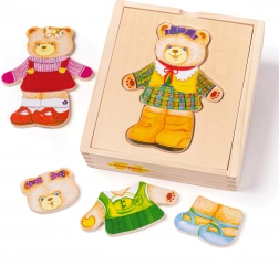 Puzzle-ul de îmbrăcat Doamna Ursoaică de la BIGJIGS TOYS îi distrează pe cei mici prin alcătuirea fețelor cu diverse expresii și a ținutelor colorate. Plăcuța servește drept suport și capac al cutiei, astfel încât piesele se depozitează ușor, iar puzzle-ul este ideal și pentru călătorii.