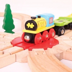 Extinde-ți calea ferată din lemn cu o turnantă practică, care adaugă noi posibilități de joc și construcție. Datorită celor opt ieșiri, locomotivele și vagoanele se pot roti cu ușurință și se pot conecta în direcții diferite, susținând imaginația, îndemânarea și coordonarea copiilor.