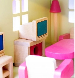 Acest set de mobilier din lemn pentru căsuțele de păpuși este soluția ideală pentru orice mic designer de interioare. Setul conține tot ce este necesar pentru a echipa bucătăria, sufrageria, dormitorul, baia și chiar mansarda.
