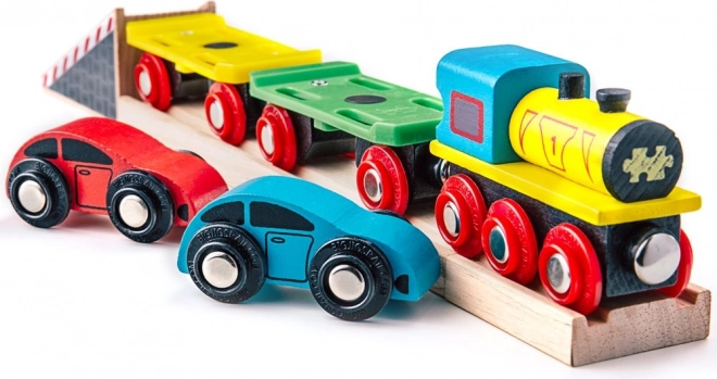 Locomotiva cu două vagoane transportă două mașinuțe în culori vii – ideal pentru scenarii de încărcare, transport și descărcare.