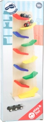 Acest turn de cascadă din lemn, de înaltă calitate, oferă copiilor porții nesfârșite de distracție plină de acțiune. Este suficient să așezi micuța mașinuță articulată în vârf și să urmărești cum coboară pe fiecare rampă, producând caracteristicul „clap clap”. Jocul stimulează văzul, auzul și coordonarea mână–ochi.