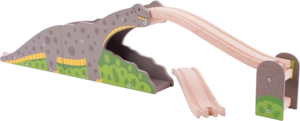 Descoperă distractivul pod cu dinozaur pentru piste de trenulețe din lemn, unde calea ferată se întâlnește cu aventura preistorică. Trenulețul trece peste spatele „brontozaurului” și pe sub el, adăugând jocului tensiune, imaginație și antrenând motricitatea fină. Compatibil cu majoritatea pistelor de trenulețe din lemn de pe piață.