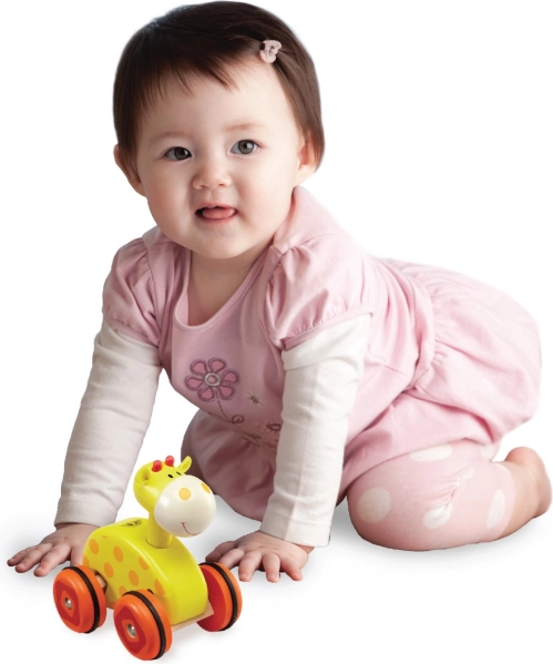 Această veselă girafă pe roți este primul vehicul ideal pentru mâinile celor mici. Prin înclinarea jucăriei, copilul schimbă ușor direcția de mers, dezvoltând natural coordonarea mână–ochi și încurajând jocul activ. Inelele din cauciuc de pe roți asigură deplasare lină și silențioasă pe diverse suprafețe.
