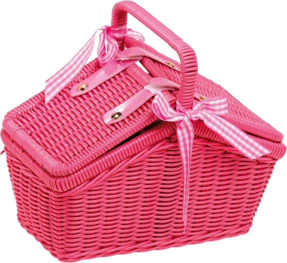 Acest coș de picnic roz este însoțitorul ideal pentru excursii cu păpușile și pentru ceaiurile copiilor. Designul modern în stilul anilor ’70, combinat cu vesela metalică cu model floral, îi va încânta pe micii gazde și oaspeți. Coșul din răchită artificială este suficient de încăpător pentru întregul set de veselă și pentru micile bunătăți.