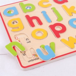 Această placă educativă din lemn de la Bigjigs Toys este un instrument ideal pentru primele întâlniri cu alfabetul englez. Datorită literelor încastrate și imaginilor din interiorul fiecărei forme, copiii înțeleg mai ușor legătura dintre literă și cuvânt și, în același timp, își antrenează motricitatea fină și coordonarea mână–ochi.