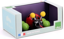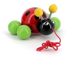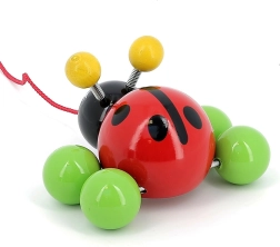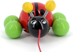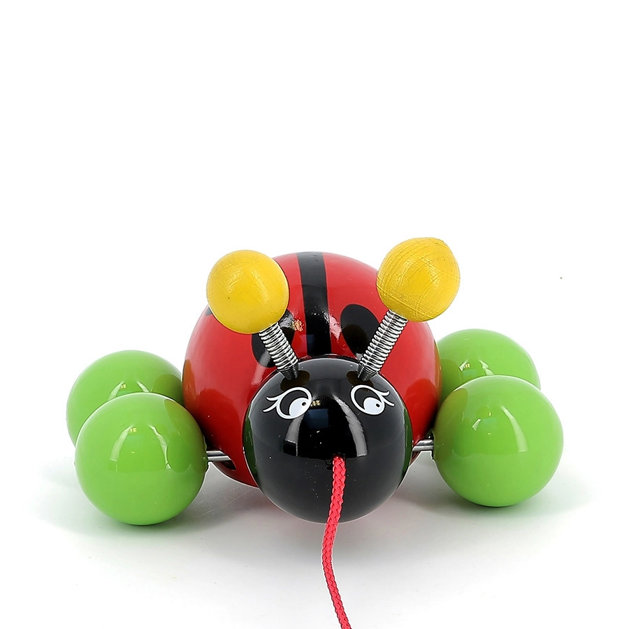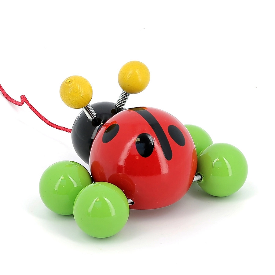Această gărgăriță clasică de tras, din lemn lăcuit, încântă prin designul colorat, suprafața netedă și antenele elastice care se leagănă voios în timpul tragerii. Datorită roților rotunjite, rularea este lină, iar copiii își antrenează în mod natural coordonarea pașilor și siguranța la mers.