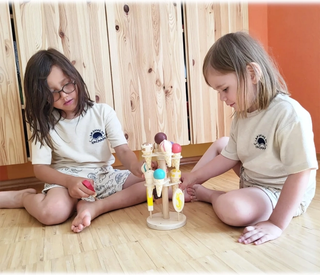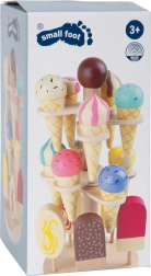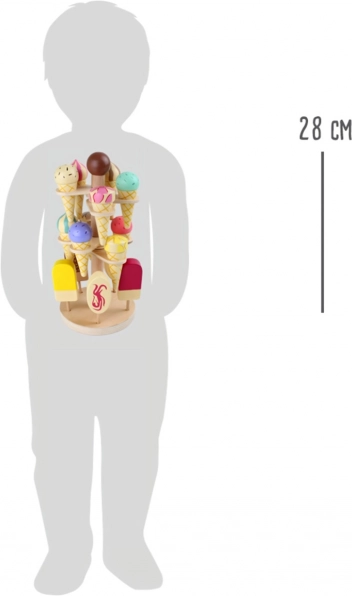 Standul de înghețată din lemn Small Foot încurajează copiii la joacă creativă și îi ajută să-și dezvolte abilitățile cognitive și de comunicare. Acest set colorat include trei nivele cu zece înghețate și cinci pe stick, care pot fi așezate în găuri circulare sau în suportul standului.