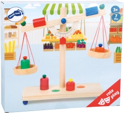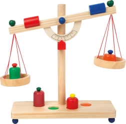 Această balanță cu pârghie fabricată din lemn masiv de calitate este echipată cu patru greutăți clasice și două mobile. Copiii pot verifica și cântări diverse obiecte precum fructele sau legumele. Datorită componentelor colorate, acest produs este foarte distractiv și în același timp educativ.