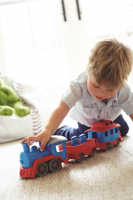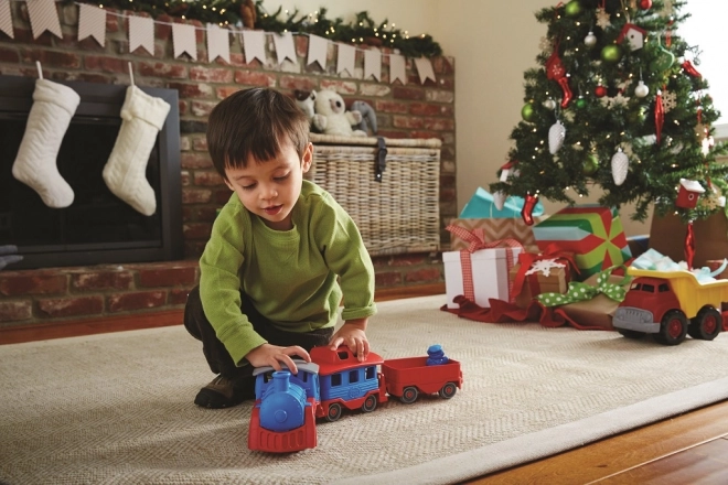 Urcă la bord! Acest tren robust de la Green Toys, cu locomotivă și două vagoane, aduce joacă creativă atât acasă, cât și afară. Este fabricat din 100% plastic reciclat din sticle de lapte, nu conține BPA, PVC sau ftalați și nu are ax metalic sau vopsea exterioară. Include doi controlori ursuleți, iar toate piesele se pot detașa ușor și se pot spăla în mașina de spălat vase.