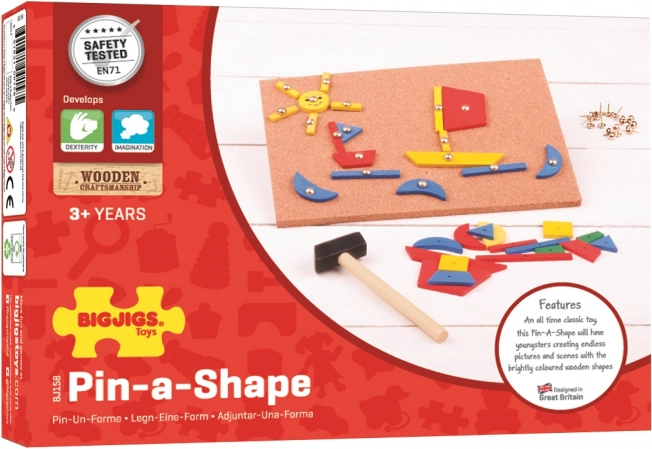 Această placă cu piuneze, plină de culoare, este ideală pentru micii constructori. Copiii pot combina formele din lemn colorate după șabloanele incluse sau după propria imaginație și le pot fixa cu piuneze lucioase. Setul include și un ciocănel solid și o placă de plută, astfel încât totul este gata de joacă imediat după despachetare.