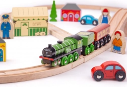 Flying Scotsman este unul dintre cele mai cunoscute trenuri ale epocii sale, iar cu acest set din lemn copiii pot retrăi călătoriile sale celebre. Setul include un tren frumos realizat, care te poartă într-o călătorie nostalgică plină de viaducte și peisaje naturale. Sunt incluse și gări retro, case și mașini de-a lungul traseului.