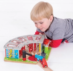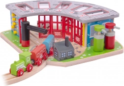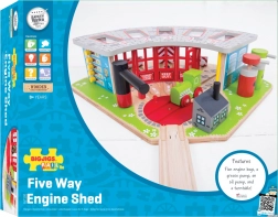 Depoul din lemn este proiectat pentru cinci trenulețe diferite și include o masă rotativă funcțională care permite mișcarea ușoară a trenurilor între diferite garaje. Sistemul include uși care se deschid și o stație de alimentare, contribuind la o experiență de joc realistă.
