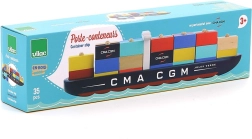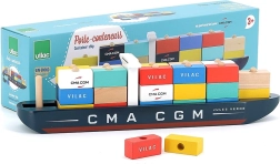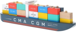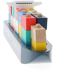 Această navă portcontainer din lemn, stilată, oferă un joc realist cu containere pe pini, care pot fi asamblate, sortate și mutate după preferință. Copiii își exersează coordonarea mână–ochi și învață bazele logisticii și sortării culorilor și formelor.