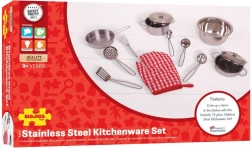 Setul de veselă de bucătărie pentru copii, din metal, cu aspect profesionist, îi va încânta pe micii bucătari și le va stimula imaginația. Conține 13 piese, inclusiv un prosop/manșon termoizolant practic, respectă standardele europene de siguranță și este ideal pentru jocul de-a gătitul. Metal durabil, dezvoltarea creativității și a motricității, excelent pentru jocuri de rol.
