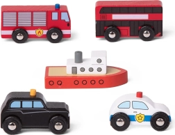 - 5 piese în pachet: autospecială de pompieri, mașină de poliție, autobuz etajat, taxi, barcă.