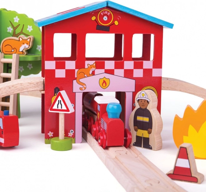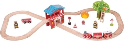 Această cale ferată din lemn cu tematica stației de pompieri transformă orice cameră într-un centru de salvare. Copiii pot trece prin tunelul remizei de pompieri, pot concura cu autospeciala, pot trimite trenul de salvare cu vagoane detașabile și îi pot ajuta pe pompieri cu scara sau hidrantul. Datorită detaliilor bogate și construcției robuste, jucăria dezvoltă excelent imaginația și îi învață pe copii să rezolve situații.