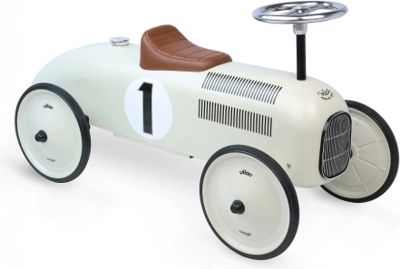 Premergătorul stilat pentru copii, cu aspect de mașină de curse, impresionează prin farmecul retro și construcția metalică de calitate. Oferă deplasare silențioasă datorită roților cauciucate, manevrare ușoară cu volan și structură solidă cu capacitate de 20 kg – ideal pentru micii piloți de la 1,5 ani.