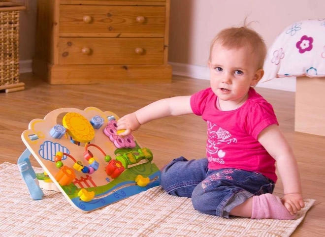 Labirintul cu mărgele, discul rotativ și elementele glisante susțin prinderea, coordonarea mână–ochi și explorarea curioasă încă de la 6 luni.