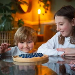 Tabla circulară din lemn fin și bilele lucioase din sticlă oferă o senzație plăcută la joc și o durată lungă de viață.