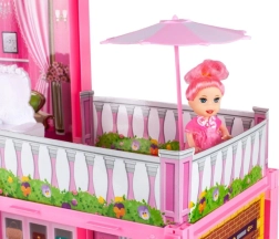 Căsuța oferă un balcon spațios cu umbrelă de soare – locul ideal pentru relaxarea păpușii și pentru o mică terasă în aer liber. Perfect pentru a crea povești și scene din viața de zi cu zi.