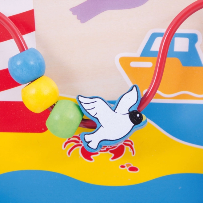 Această tablă activă din lemn, cu tematică marină, oferă copiilor o paletă variată de activități: labirint rotativ, căluți de mare care se rotesc, peștișori glisanți și sârmă cu mărgele cu pescăruși. Fiecare element este conceput pentru a sprijini dezvoltarea naturală a abilităților, a răbdării și a concentrării. Datorită prinderilor ajustabile, tabla poate fi fixată în siguranță și de pătuț, oferind bebelușului stimulare la îndemână.