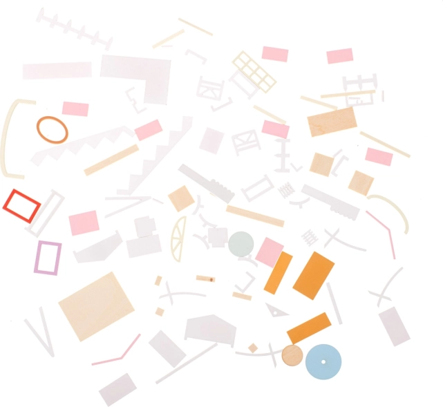 - piese de construcție, accesorii de interior, adeziv, manual detaliat cu imagini, unelte (riglă, foarfecă, pensetă, cutter, șurubelniță)