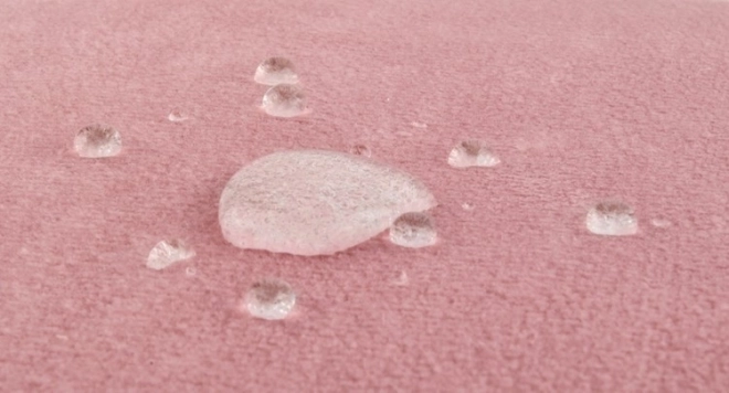 Materialul catifelat CLEANABOO nu absoarbe imediat lichidele – băuturile vărsate rămân în picături și se șterg ușor.