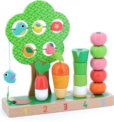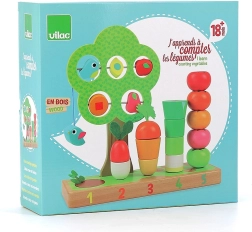 Această jucărie din lemn de înaltă calitate îmbină joaca și învățarea într-un singur produs. Copiii așază și înșiră morcovi, praz, roșii mici și alte forme pe țărușii numerotați 1–5, însușindu-și în mod natural numărarea și sortarea după culori și dimensiuni. Setul include și un copăcel cu elemente glisante pentru explorare și antrenarea coordonării mână–ochi.