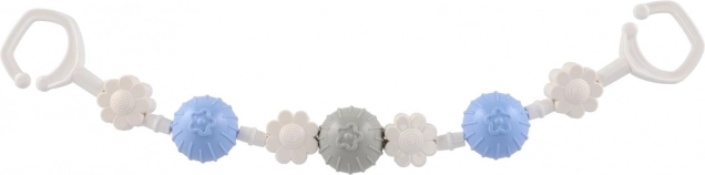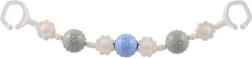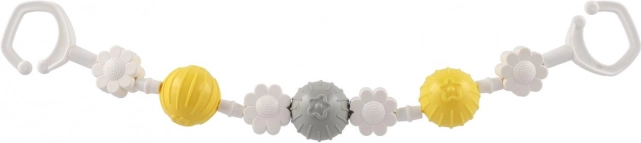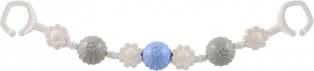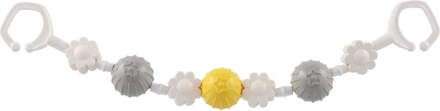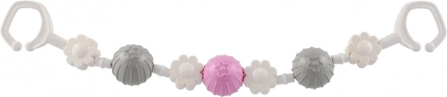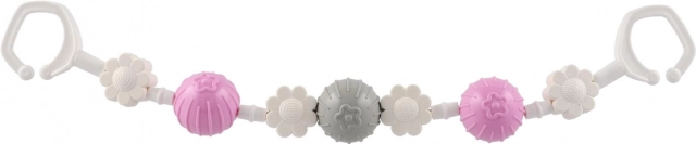 Această bară/jucărie universală pentru cărucior combină biluțe rotative și forme florale, care susțin dezvoltarea motricității fine, a văzului și auzului. Suprafațele și culorile variate stimulează curiozitatea, în timp ce zornăitul discret liniștește bebelușul și îl distrează în plimbări.