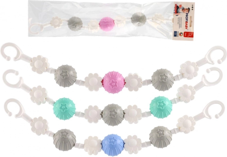 Florile și biluțele alternante, cu texturi diferite, stimulează simțul tactil, vederea și capacitatea de concentrare și încurajează bebelușul să apuce și să rotească.