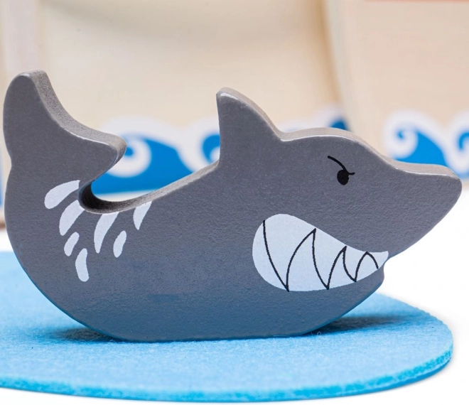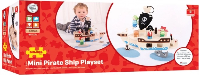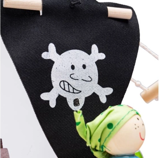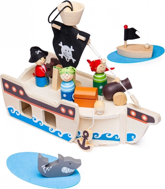 Acest set de vapor pirat din lemn include tot ce au nevoie micii pirați pentru aventurile lor. Ambalajul include un căpitan, doi pirați, un vapor, o ancoră, un cufăr cu comori și un rechin. Toate elementele de joc pot fi plasate practic în vapor, fiind astfel ideal pentru călătorii și transport ușor.