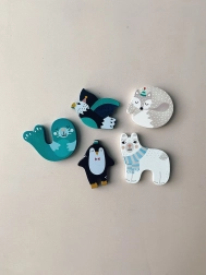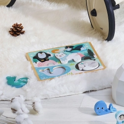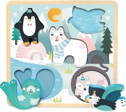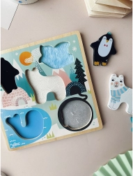 Acest puzzle senzorial din lemn, cu animale polare (pinguin, urs polar, focă, balenă și păsărică), aduce copiilor bucuria descoperirii. După scoaterea pieselor masive, copiii vor simți plăcuțe cu texturi diferite, care sprijină percepția suprafețelor și îi învață să distingă forme și materiale. Construcția robustă din lemn este durabilă și ușor de prins chiar și pentru cele mai mici mâini.