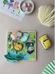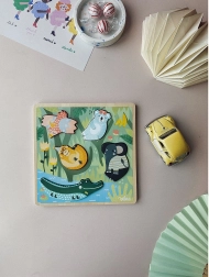 Designul semnat de Michelle Carlslund, în culori pastelate delicate, oferă jucăriei un aspect atrăgător și stimulează imaginația. Baza din lemn cu decupaje și motive de animale îi învață pe copii să potrivească forme, să recunoască culori și animale. Puzzle-ul este durabil, sigur și realizat din lemn de calitate, în combinație cu materiale textile.