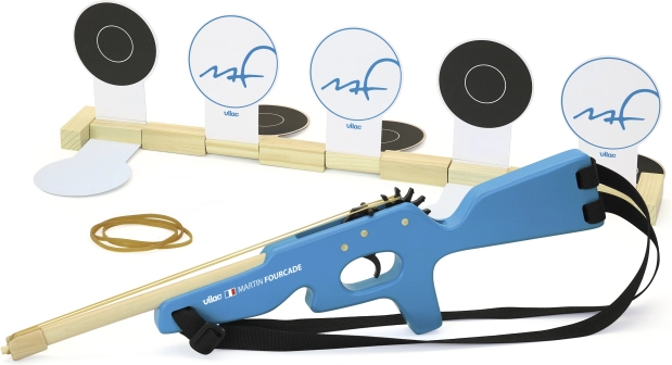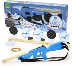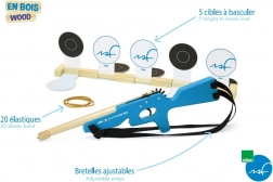Pușca din lemn este echipată cu curele textile ajustabile, ideale pentru fiecare copil. Pachetul include cinci ținte rabatabile și douăzeci de elastice pentru tragere repetată. Încercați să ajustați țintele la distanțe diferite și testați-vă precizia!