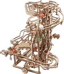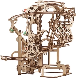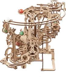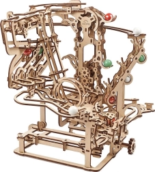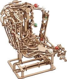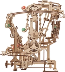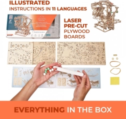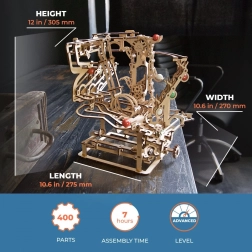Această pistă de bile elaborată, din placaj de calitate, îmbină plăcerea modelismului, valoarea educativă și un spectacol relaxant. Liftul cu lanț acționat manual transportă lin bilele la start, de unde pornesc pe trei secțiuni separate, fiecare cu un obstacol principal unic. Designul deschis evidențiază mecanica funcțională și detaliile fine.