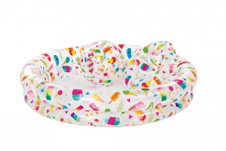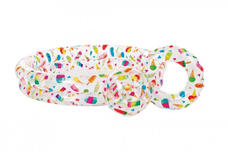 Setul include piscină gonflabilă, colac de înot și minge de plajă – copiii se pot bălăci, prinde mingea și căpăta încredere în apă.