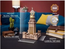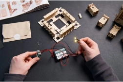 Setul include 340 de piese din lemn tăiate cu precizie și un ghid detaliat. Asamblarea este accesibilă chiar și începătorilor mai îndemânatici, oferind totodată suficientă provocare pentru avansați. Alimentarea se poate face opțional prin USB‑C sau 3× AA (nu sunt incluse în pachet), astfel încât modelul se integrează ușor în orice spațiu.
