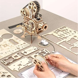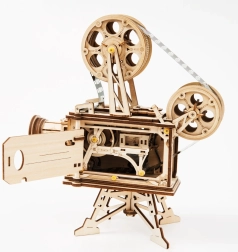 Acest model de proiector din lemn, cu stil retro, impresionează prin angrenaje elaborate, bobine și detalii autentice. Asamblați mecanismul pas cu pas, introduceți banda de film inclusă și bucurați-vă de mini-cinema la tine acasă. Datorită generatorului manual nu aveți nevoie de baterii – este suficient să rotiți manivela și proiecția poate începe.