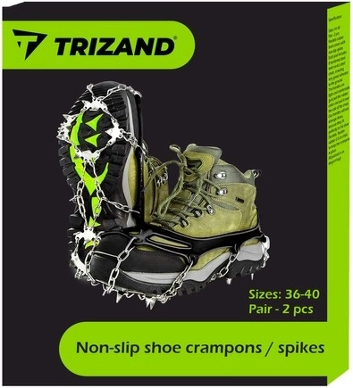 Cramponii antiderapanți TRIZAND sunt alegerea ideală pentru drumeții de iarnă, mers urban și plimbări în natură. Fiecare crampón este echipat cu 8 țepi din oțel conectați prin lanțuri din oțel inoxidabil, sporind stabilitatea pe suprafețe înghețate sau umede. Materialele rezistente și construcția bine gândită protejează încălțămintea și asigură durabilitate îndelungată.