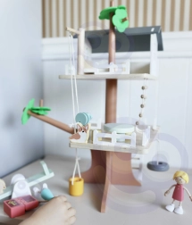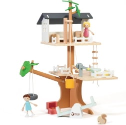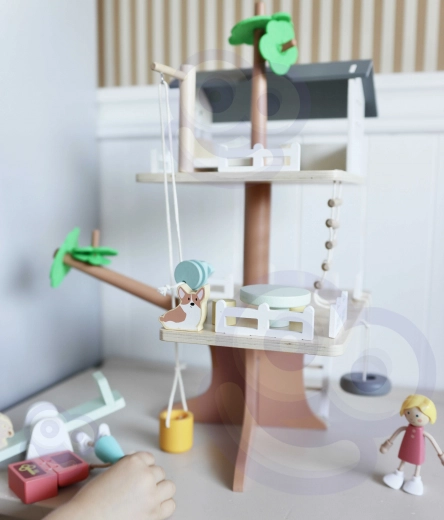 Pachetul conține 31 de elemente, inclusiv 2 figurine de copii, 2 animăluțe și accesorii precum leagăn, leagăn-anvelopă, leagăn de echilibru, pat, masă, scaune și cufăr cu comori. Lemnul natural atent finisat, cu culori delicate, este durabil și plăcut la atingere.