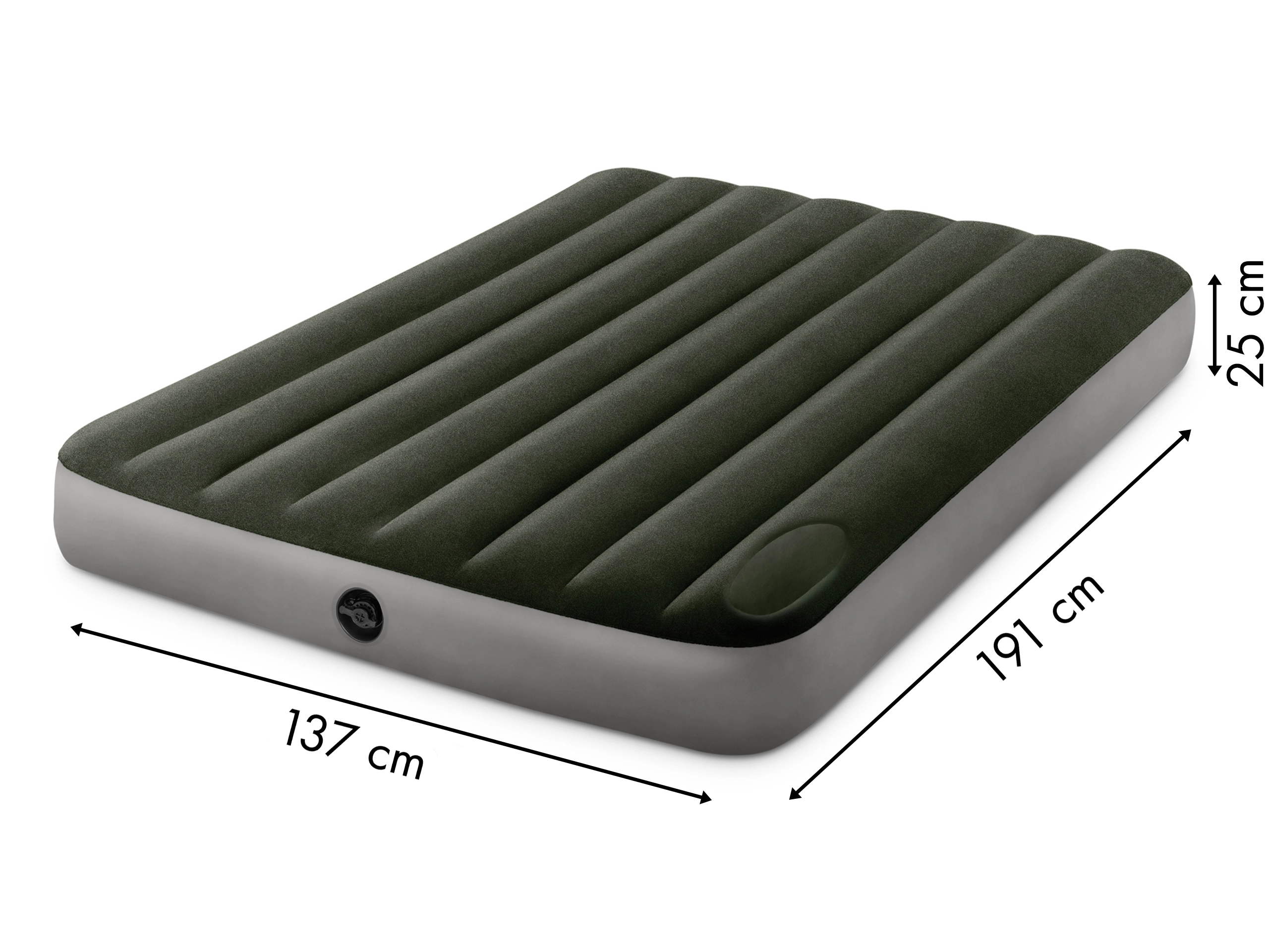 Saltea gonflabilă cu dimensiunile 1,37 m x 1,91 m x 25 cm. Sarcină maximă 272 kg. Timp de umflare: 3,5 minute.