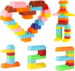 Marele mix de cuburi multicolore inspiră la construirea de căsuțe, personaje, numere și modele originale.